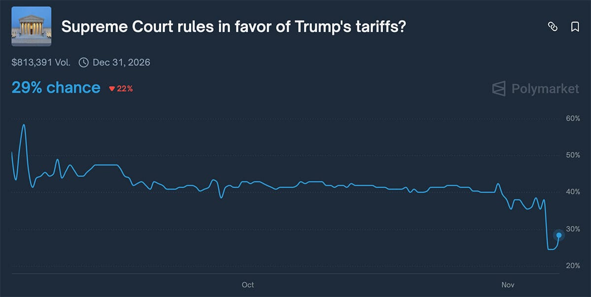 Prediction markets aren’t feeling optimistic for the White House. After oral arguments on Wednesday, the odds of the government winning dropped from 38% to 29%.