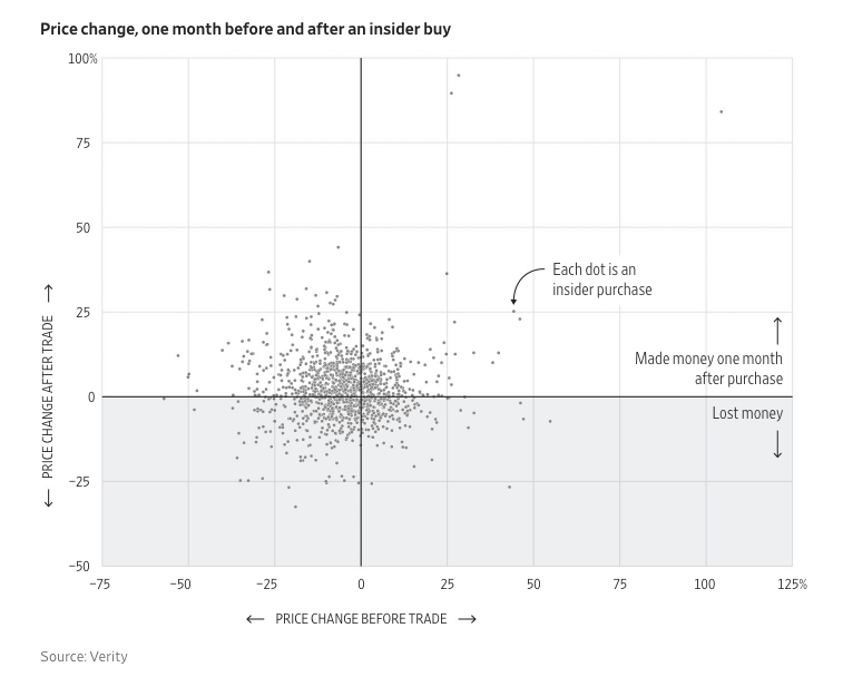 Insider buying tends to happen after stocks fall. A study of 1,400 insider purchases revealed that roughly 69% occurred following a negative one-month return.