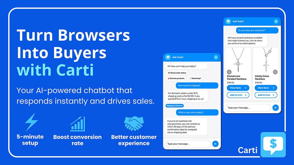 If you want to monetize your Shopify traffic without hiring more support or spending more on ads, Carti does the selling for you — day and night.